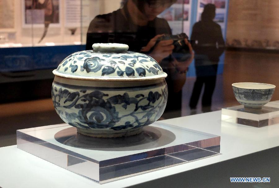 | A visitor takes photos of a displayed chinaware of Ming Dynasty (1368-1644) during an antique exhibition of the Maritime Silk Road in Jinan, capital of east China's Shandong Province, Aug. 28, 2014. The exhibiton, displaying some 300 antiques related to the Maritime Silk Road, opened here Thursday. (Xinhua/Xu Suhui) |