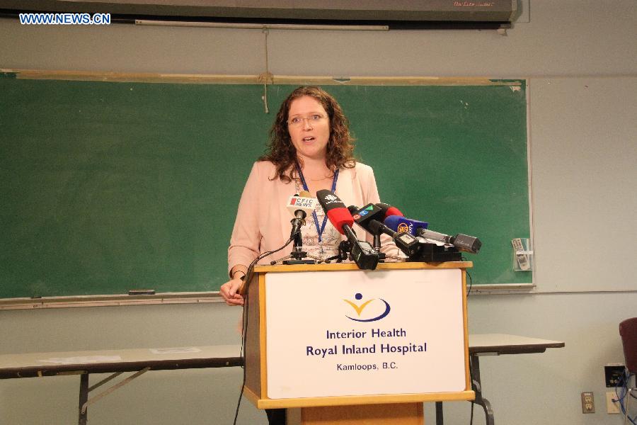 Michaela Swan, speaker of Royal Inland Hospital in Kamloops, speaks during a press conference on the status of injured people being treated in the hospital, in Kamloops, Canada, Aug. 29, 2014. Fifty-six people were injured, six of them critically, when a tour bus carrying Chinese passengers and others of Asian descent crashed along a major interior highway in the Canadian province of British Columbia on Thursday. These passengers were treated well in various nearby hospitals and they are either in stable conditions or released from the hospitals after being treated properly. (Xinhua/Jiang Yaping)