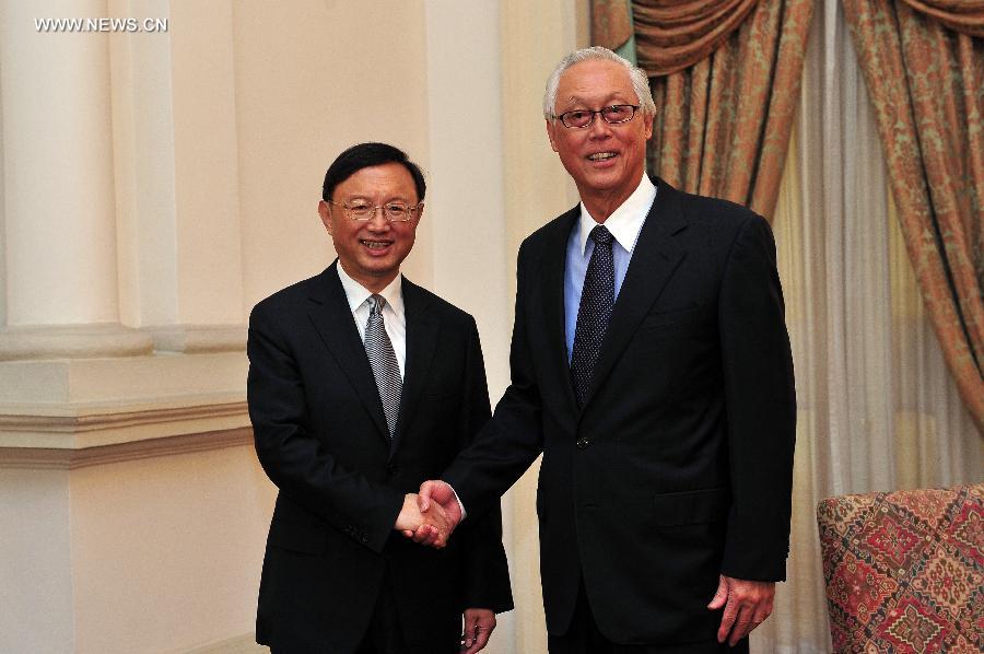 Singapore' s Emeritus Senior Minister Goh Chok Tong (R) meets with China' s State Councillor Yang Jiechi at Singapore' s Istana on Aug 29, 2014. Yang Jiechi is on a three-day official visit in Singapore. (Xinhua/Then Chih Wey)