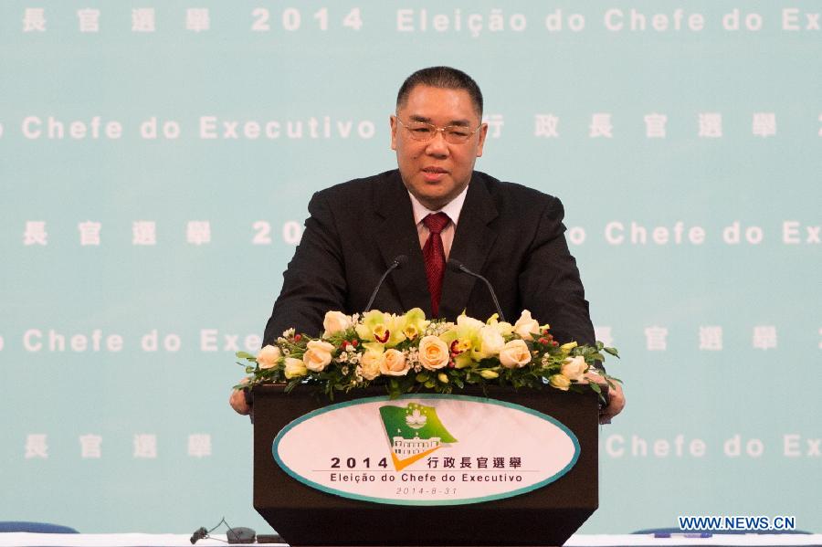 Chui Sai On delivers a speech after he was elected the fourth- term chief executive of China's Macao Special Administrative Region (SAR) in Macao, south China, Aug. 31, 2014. Chui won 380 electoral votes from the 396 Election Committee members, who were at present for the voting. (Xinhua/Cheong Kam Ka)