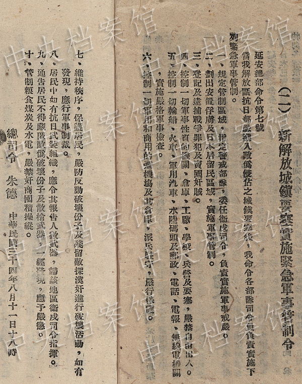 On August 11, 1945, the headquarters of the CPC issued order No. 7. (Photo/China's State Archives Administration)