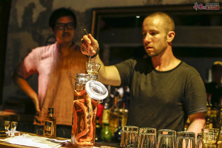 The shop treasure - medicinal liquor with a snake infused in.(china.org.cn/ Zhang Hao)