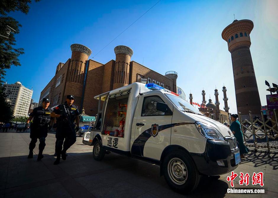 A new type of anti-terrorism electric patrol car is seen on street in Urumqi, capital of northwest China's Xinjiang Uygur Autonomous Region on Aug. 28, 2014. The electric-powered car is installed with advanced equipment such as police searchlight and real-time monitoring device. (Photo/ Liu Xin)
