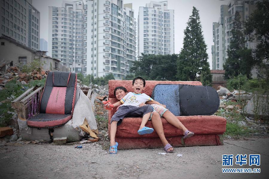 Liu Jing plays with the house owner's son, Aug. 24, 2014. (Xinhua News Agency/ Lai Xinlin)