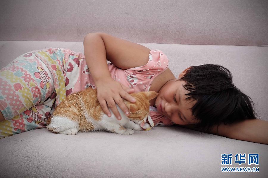 Liu Jing plays with Ah Huang on an old couch, Aug. 24, 2014. (Xinhua News Agency/ Lai Xinlin)