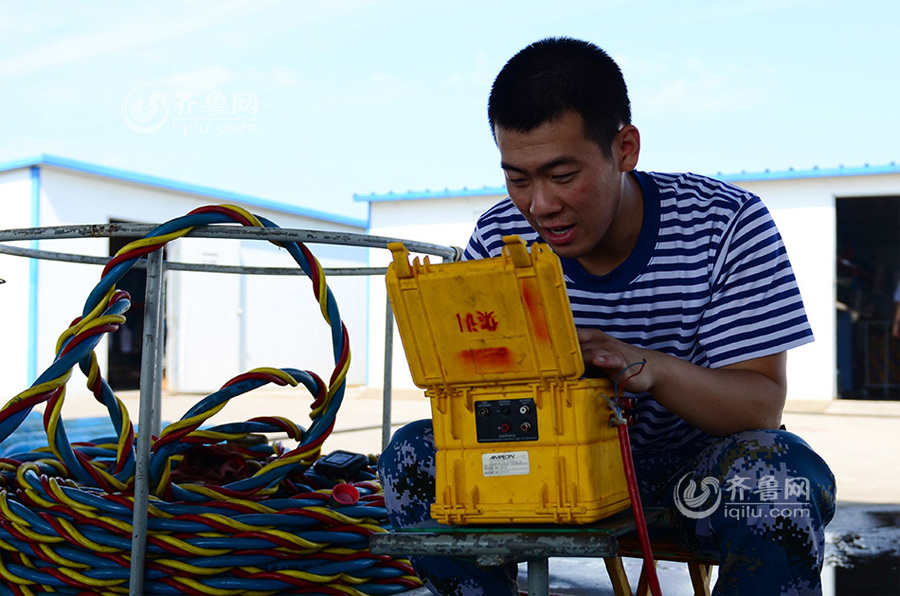 A soldier on the land communicates with the diver who is underwater through communication equipment. (iqilu.com/ Sun Zhiwen)