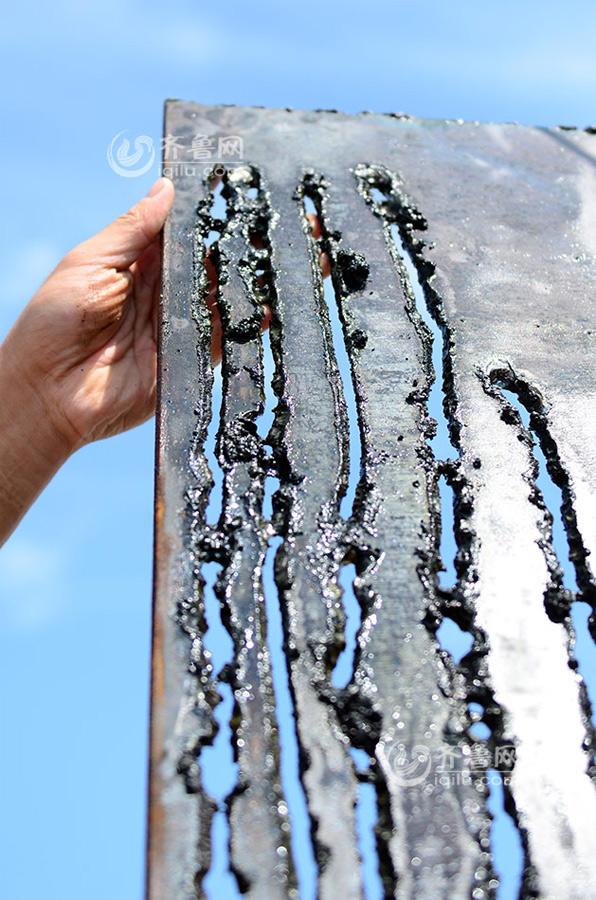 A diver shows an iron plates he cuts underwater. (iqilu.com/ Sun Zhiwen)
