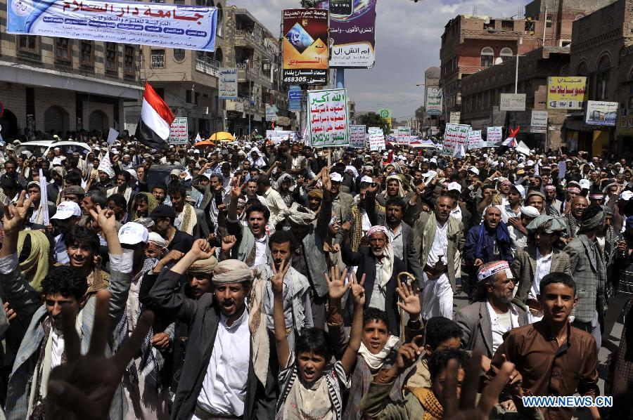 Yemeni protestors shout slogans during a demonstration in Sanaa, Yemen, on Sept. 1, 2014. Thousands of supporters of the Shiite Houthi group rallied in Sanaa, demanding the resignation of the government and broader political partnership. (Xinhua/Mohammed Mohammed)