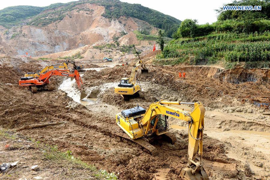 Excavators work at the site where a landslide occurred in Yingping Village, Fuquan City of southwest China's Guizhou Province, Aug. 31, 2014. Rescuers combing the rubble at the landslide site here retrieved two more bodies Sunday morning, bringing the total death toll in the disaster to 22, rescue authorities said. Twenty-two others have been injured and one has remained missing as of 10 a.m., four days after a 600-meter-high knoll broke free and swept into the village. (Xinhua/Wu Rubo)