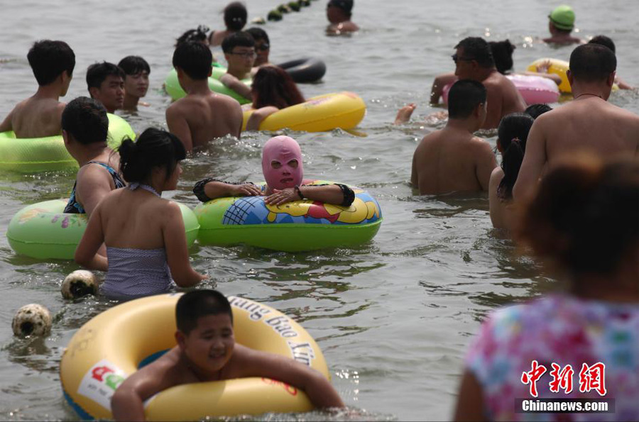 A 'facekini' dama swims on Aug. 19, 2012. (China News Service/Xu Chongde)