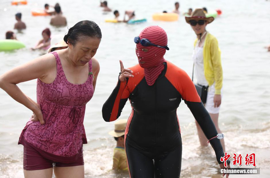 A 'facekini' dama talks with her friend, Aug. 19, 2012. (China News Service/Xu Chongde)