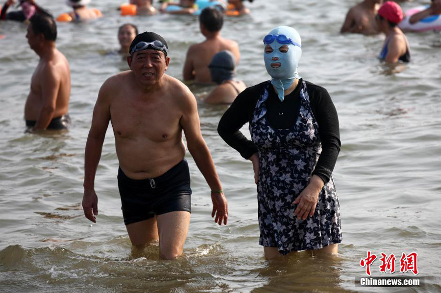 A 'facekini' dama goes on shore, July 12, 2013. (China News Service/Xu Chongde)