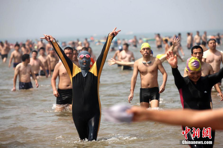 'Facekini' damas participate in a seaside tourism activity in Qingdao, Aug. 8, 2013. (China News Service/Xu Chongde)