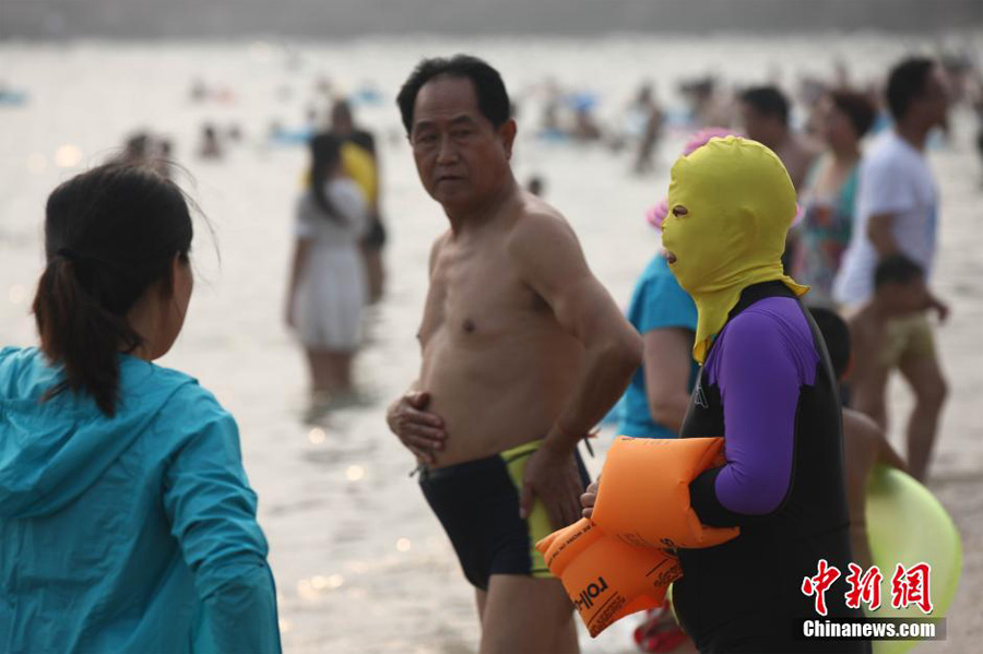 An old man looks at a 'facekini' dama curiously, July 20, 2010. (China News Service/Xu Chongde)