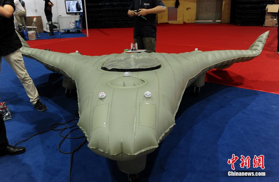 An inflatable aircraft meets the public at Tianjin International UAV Exhibition on Aug. 29 2014. Inflatable aircraft is the aircraft without rigid skeleton. Comparing with normal aircraft, it has big load capacity, good flexibility and high impact resistance. It can be used for low speed and low altitude navigation, aerial survey and remote sensing. (CNS/Chen Haifeng)