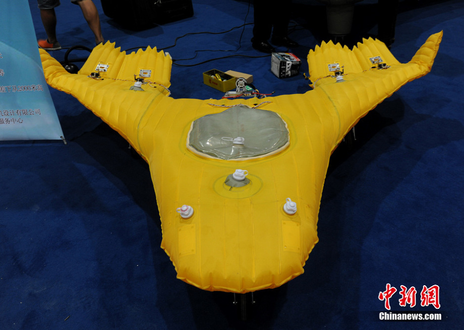 An inflatable aircraft meets the public at Tianjin International UAV Exhibition on Aug. 29 2014. Inflatable aircraft is the aircraft without rigid skeleton. Comparing with normal aircraft, it has big load capacity, good flexibility and high impact resistance. It can be used for low speed and low altitude navigation, aerial survey and remote sensing. (CNS/Chen Haifeng)