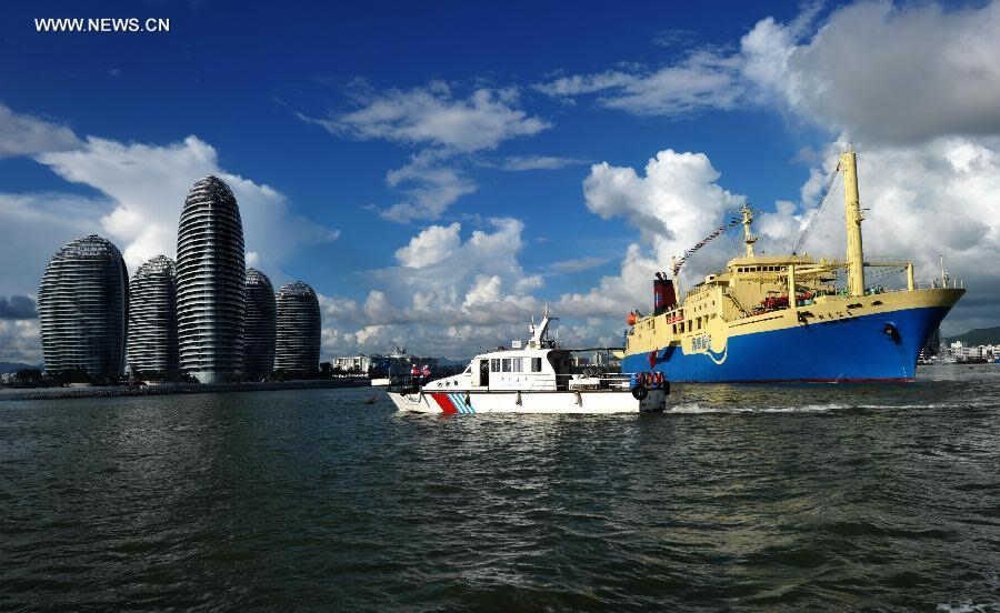 Coconut Princess, a cruise ship, leaves the port of Sanya for the Xisha Islands in south China's Hainan province on Sept. 2, 2014. The cruise trip between Sanya and Xisha was officially launched on Tuesday. The ship offers tourists a four-day, three-night cruise to Xisha, which has more than 40 islets and reefs. (Xinhua/Zhao Yingquan)