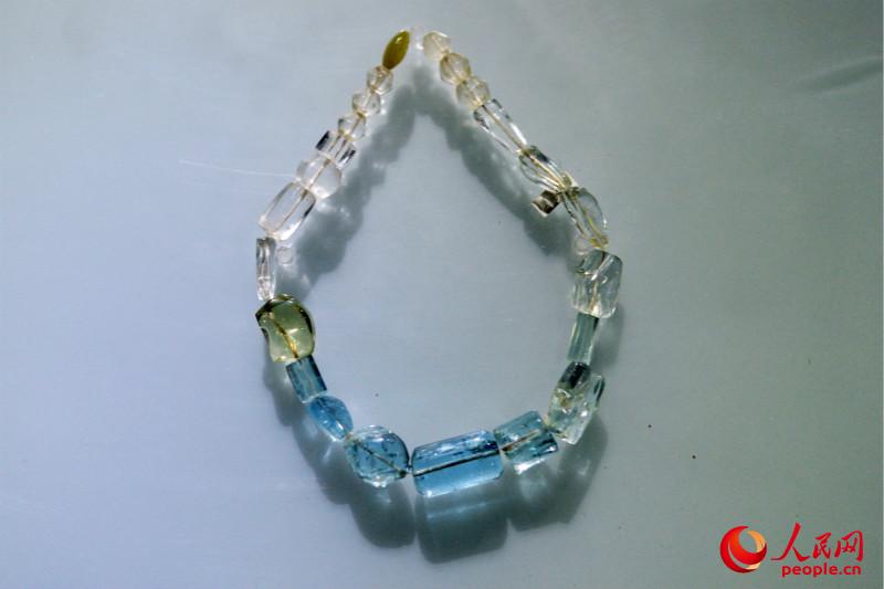 Of all the pieces in the museum, the aquamarine necklace is the most attractive. The curator of the museum, Lian Shiming, explains that this necklace was the first Han Dynasty aquamarine gemstone to be discovered. This most precious type of aquamarine, also known as beryl, is light blue. The four gemstones of the necklace are matched in this exact color. Most aquamarine comes from the seas of West Asia, and aquamarine was first used for jewelry in the West. "It was used for blessing a safe voyage, or for love and happy endings," says Lian. This necklace, once the property of a county magistrate in the Han Dynasty, now bears witness to the Maritime Silk Road.