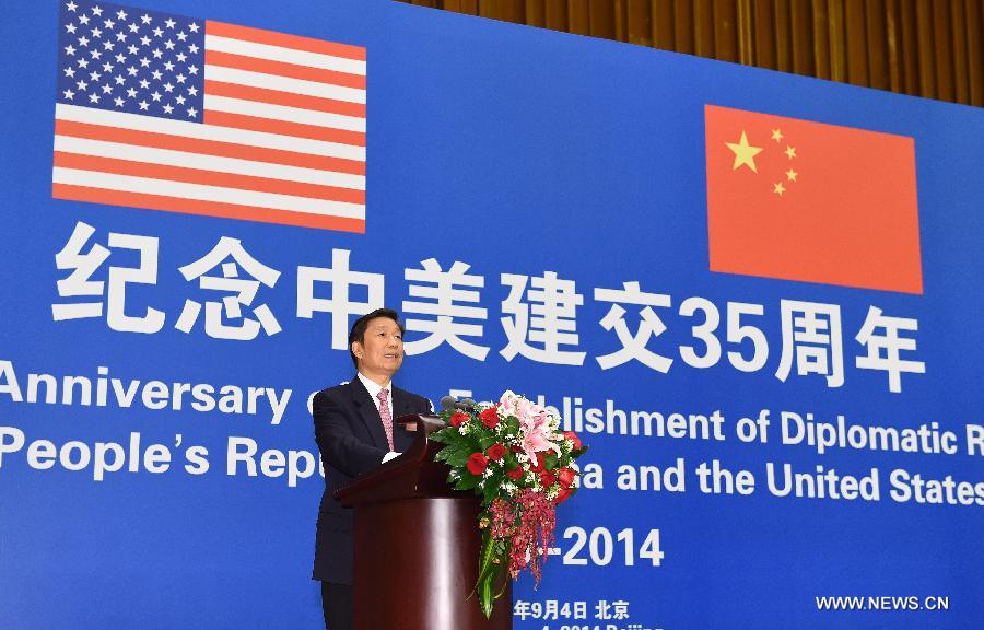 | Chinese Vice President Li Yuanchao delivers a speech at a reception held to mark the 35th anniversary of the establishment of China-U.S. diplomatic relations in Beijing, China, Sept. 4, 2014. (Xinhua/Ma Zhancheng) |