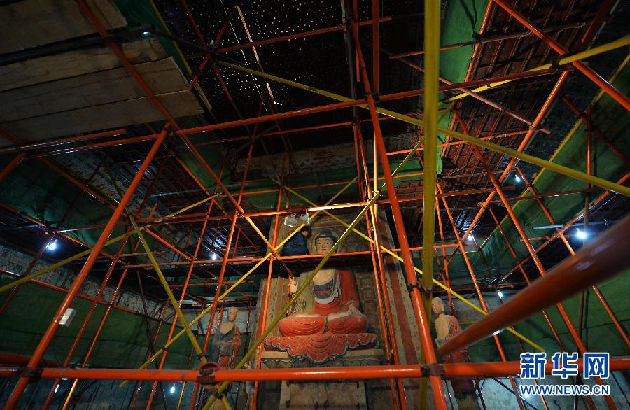 Repairing scene in the 98th Mogao Grottoes, Sept. 3, 2014. (Xinhuanet/Chen Bin)