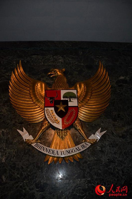 The national emblem of Indonesia on the wall. (People's Daily Online/Du Mingming)