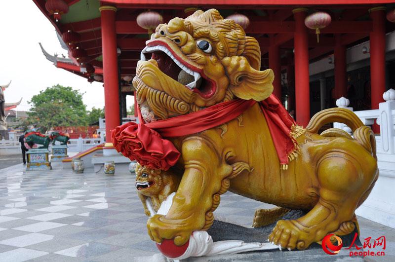 5.The colorful stone lion in front of the main temple in Sam Po Kong. (People's Daily Online/Li Haixia)