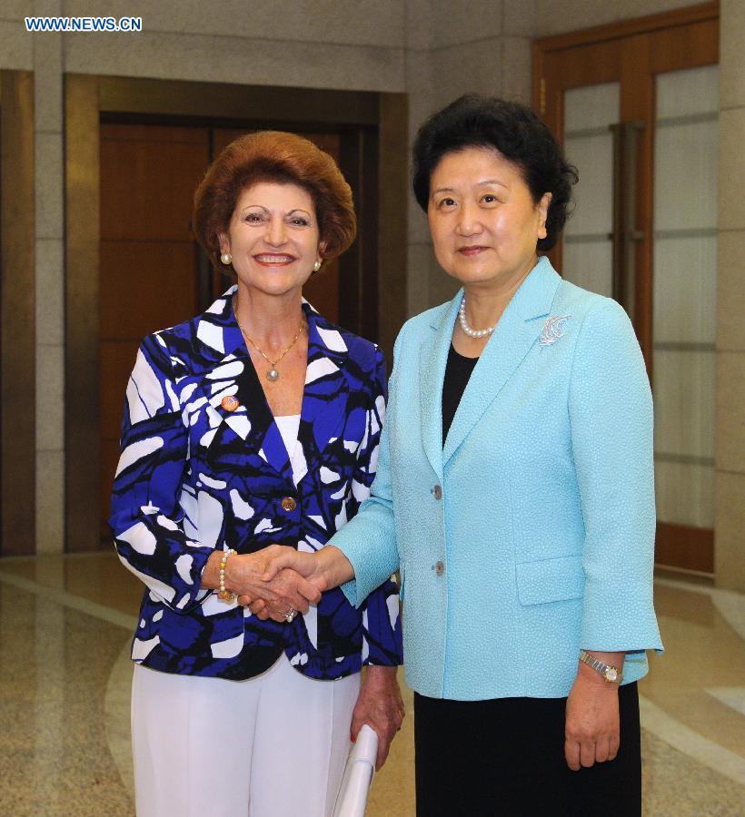 Chinese Vice Premier Liu Yandong (R) shakes hands with European Commissioner for Education, Culture, Multilingualism and Youth Androulla Vassiliou, before the second meeting of China-EU High Level People-to-People Dialogue in Beijing, capital of China, Sept. 6, 2014. Liu Yandong and Androulla Vassiliou co-chaired the meeting here on Saturday. (Xinhua/Rao Aimin)