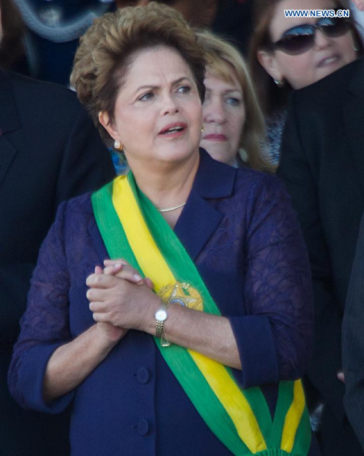 | Brazilian President Dilma Rousseff, takes part in a military parade to commemorate the Independence's Day of Brazil, in Brasilia, Brazil, on Sept. 7, 2014. Brazil celebrates the 192th anniversary of its independence on Sunday. (Xinhua/Renato Costa/Fram/Estadao Conteudo/AGENCIA ESTADO) |