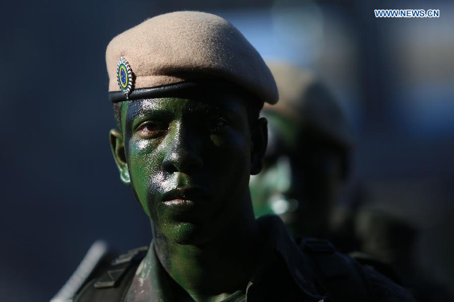 A soldier reacts in a military parade to commemorate the Independence's Day of Brazil, at the Anhembi Sambadrome, in Sao Paulo, Brazil, on Sept. 7, 2014. Brazil celebrated the 192th anniversary of its independence on Sunday. (Xinhua/Rahel Patrasso)