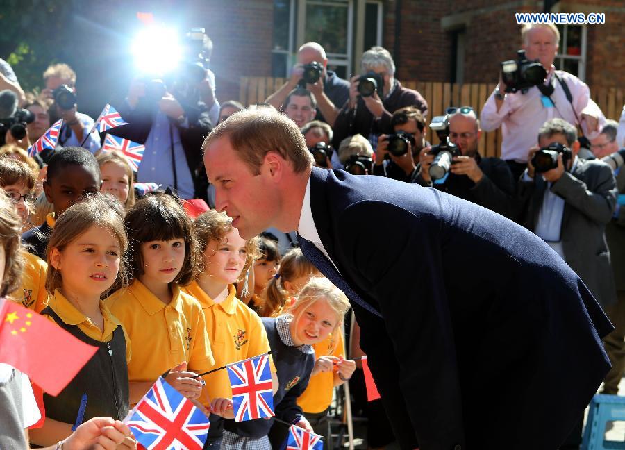 Prince William (R), Duke of Cambridge, speaks to school students as he arrives to formally inaugurate the Dickson Poon University of Oxford China Centre Building in Oxford, the United Kingdom, on Sept. 8, 2014. Prince William unveiled the Dickson Poon University of Oxford China Centre here on Monday. (Xinhua/Han Yan)