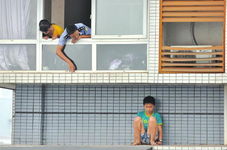 A young boy sits on a canopy as his mother and a policeman plead with him through a window of an 11th floor apartment in Yibin, Southwest China's Sichuan province, Sept 8, 2014. The boy, Xiao Kai, 12, had a disagreement with his mother who had demanded he finish his homework while the boy wanted to sleep late on Mid-Autumn Festival. The boy, afraid of being beaten, climbed out of the window to avoid punishment. (Photo Source: wccdaily.com.cn)