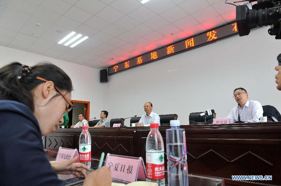 Photo taken on Sept. 9, 2014 shows the scene of the press conference held by the Jiemeifengyou Chemical Plant in Yinchuan, capital of northwest China's Ningxia Hui Autonomous Region, Sept. 9, 2014. The ammonia gas leak accident that occured on Sunday afternoon injured 49 people, among whom 33 showed poisoning symptoms and four people were seriously poisoned. (Xinhua/Peng Zhaozhi)