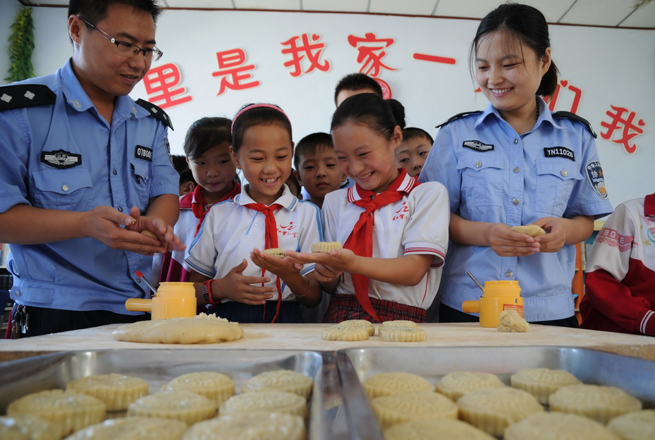 The policemen at Mamuchi police station of Yinan County, east China’s Shandong Province, make moon cakes with the leftover children at a children’s home for leftover children. (Xinhua/ Shi Lianying)