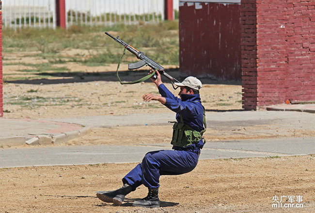 A terrorist is shot in Peace Mission 2014, a joint anti-terror military drill conducted by forces of the Shanghai Cooperation Organization (SCO) countries. (Photo/mil.cnr.cn)