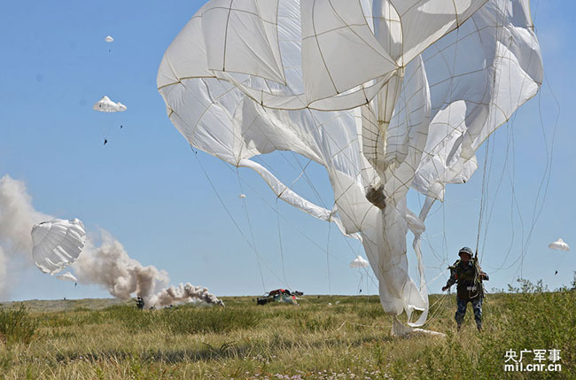 Chinese and Kazakhstan airborne combatants land on battleground in Peace Mission 2014, a joint anti-terror military drill conducted by forces of the Shanghai Cooperation Organization (SCO) countries. (Photo/mil.cnr.cn)