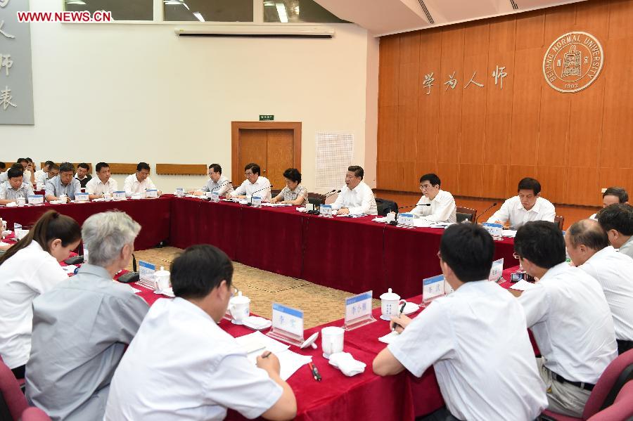 Chinese President Xi Jinping holds discussions with teachers and students at Beijing Normal University in Beijing, capital of China, Sept. 9, 2014. Xi made an inspection tour to Beijing Normal University Tuesday, the eve of Teachers' Day in China. (Xinhua/Ma Zhancheng)