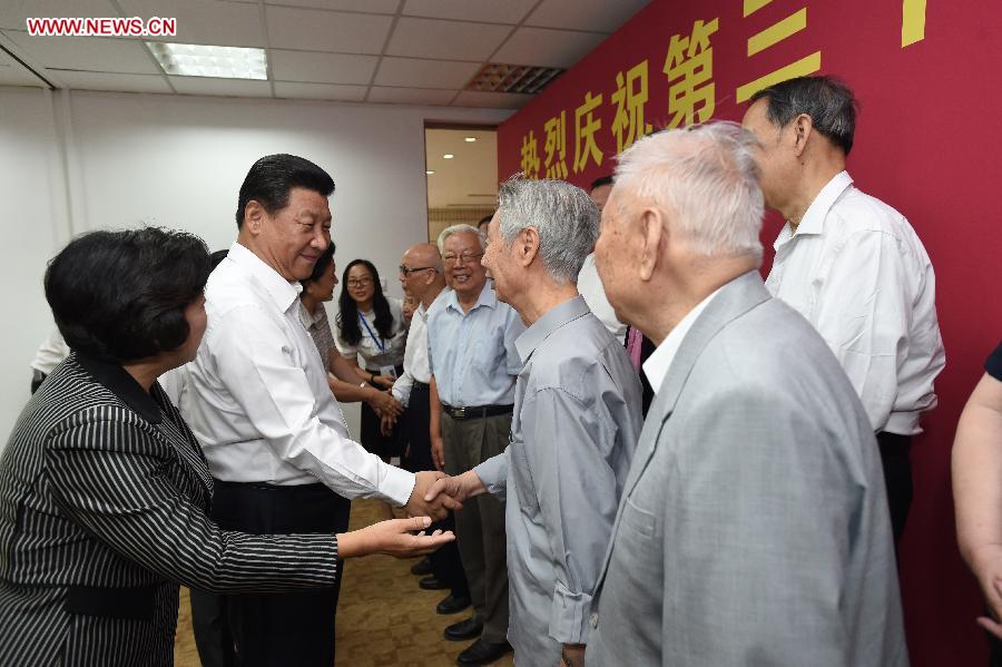 Chinese President Xi Jinping (2nd L) meets academicians and professors at Beijing Normal University in Beijing, capital of China, Sept. 9, 2014. Xi made an inspection tour to Beijing Normal University Tuesday, the eve of Teachers' Day in China. (Xinhua/Ma Zhancheng)
