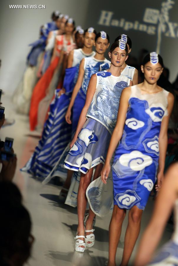 Models present creations of the 2015 FASHION SHENZHEN collection during the New York Fashion Week in New York, the United States, Sept. 7, 2014. (Xinhua/Qin Lang)