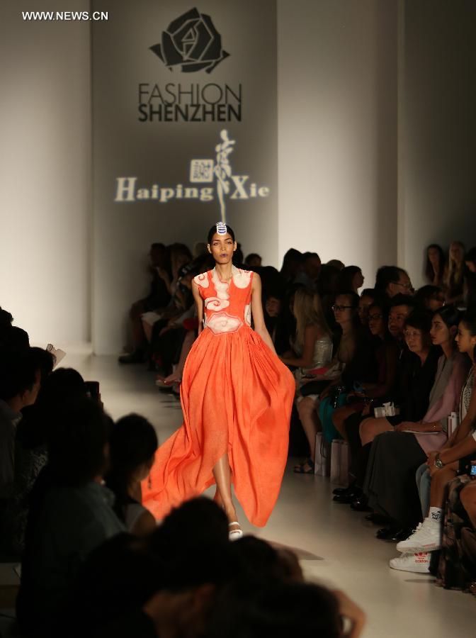 | A model present creations of the 2015 FASHION SHENZHEN collection during the New York Fashion Week in New York, the United States, Sept. 7, 2014. (Xinhua/Qin Lang) |