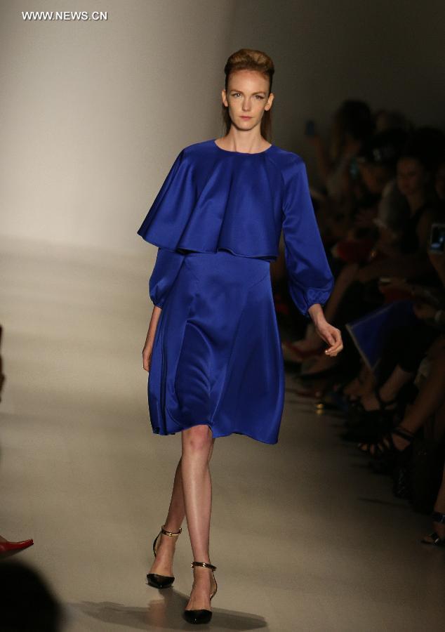 A model presents a creation of the 2015 FASHION SHENZHEN collection during the New York Fashion Week in New York, the United States, Sept. 7, 2014. (Xinhua/Qin Lang)