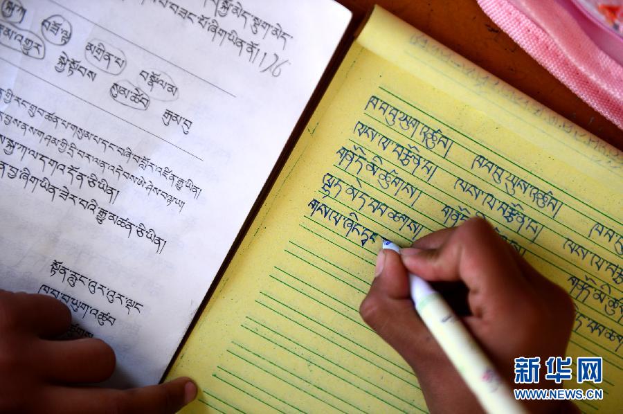 A student does homework in the Tibetan classes at Jiujia Elementary School in Labrang Town of Xiahe county, northwest China's Gansu province on Sept. 2, 2014.(Xinhua News Agency/Zhang Meng)