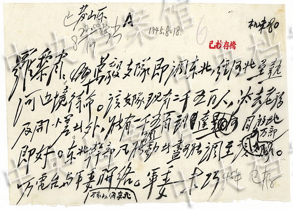On August 18, 1945, the Military Commission of the Central Committee of the CPC told General Luo Ronghuan and other officers that the detachment led by Wan Yi would be sent to the northeast China. (Photo/China's State Archives Administration)