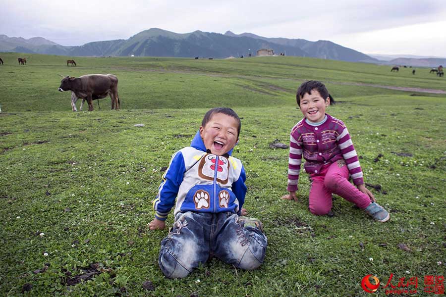 Two kids play on the grassland. (Photo/People.cn)