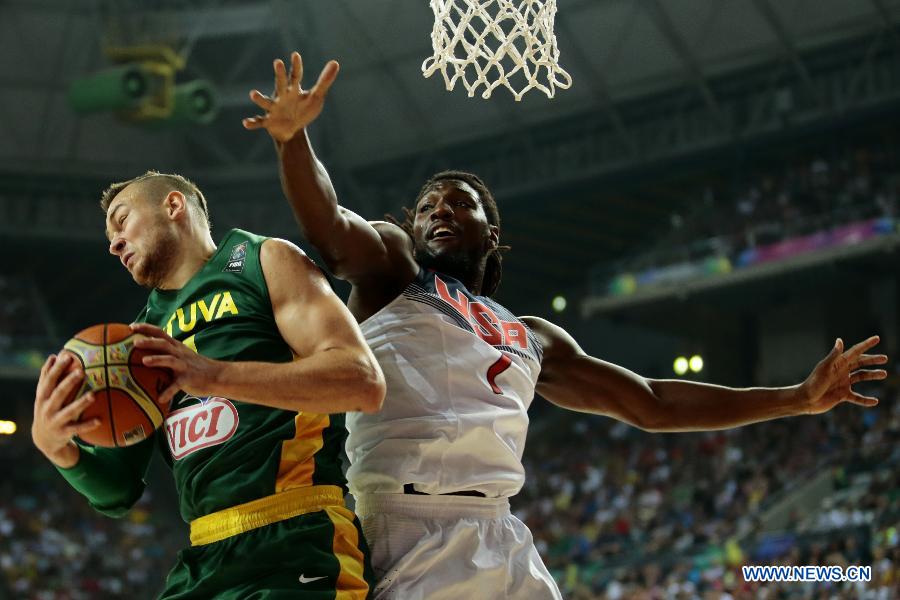 Kenneth Faried (R) of the United States blocks during the semifinal match with Lithuania at the 2014 FIBA Basketball World Cup Spain in Barcelona Sept. 11, 2014. The United States won 96-68. (Xinhua/Pau Barrena)
