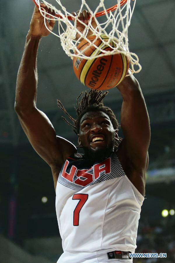 Kenneth Faried of the United States slam dunk during the semifinal match with Lithuania at the 2014 FIBA Basketball World Cup Spain in Barcelona Sept. 11, 2014. The United States won 96-68. (Xinhua/Pau Barrena)