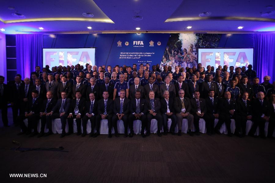 Participants pose during the inauguration of the FIFA Conference for National Coaches and Technical Directors of the World Cup Brazil 2014, in Panama City, capital of Panama, on Sept. 11, 2014. (Xinhua/Mauricio Valenzuela)