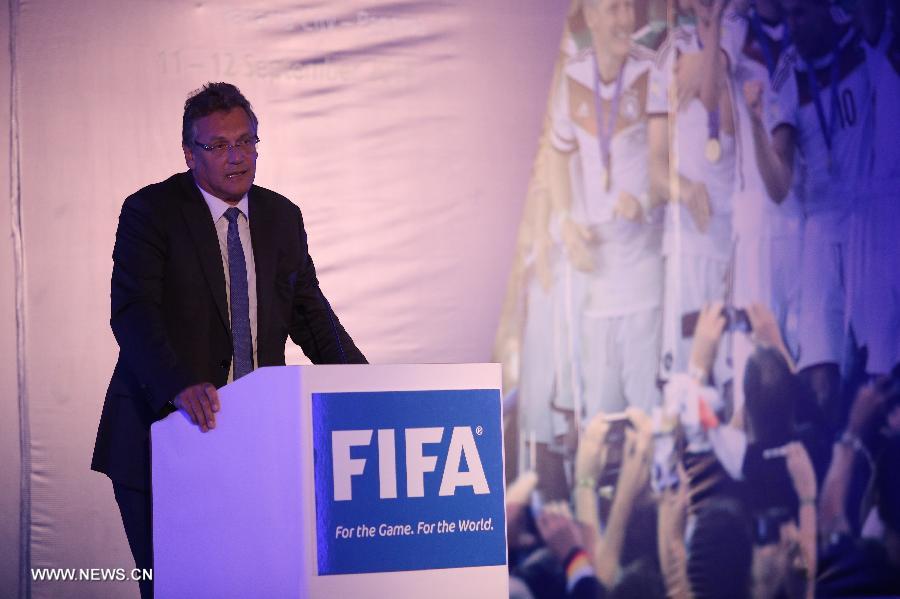 General Secretary of FIFA, Jerome Valcke, delivers a speech during the inauguration of the FIFA Conference for National Coaches and Technical Directors of the World Cup Brazil 2014, in Panama City, capital of Panama, on Sept. 11, 2014. (Xinhua/Mauricio Valenzuela)