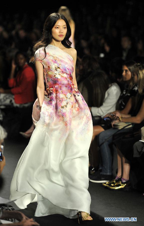 A model displays a creation of Naeem Khan Spring 2015 collection during the New York Fashion Week in New York, the United States, on Sept. 9, 2014. (Xinhua/Wang Lei)