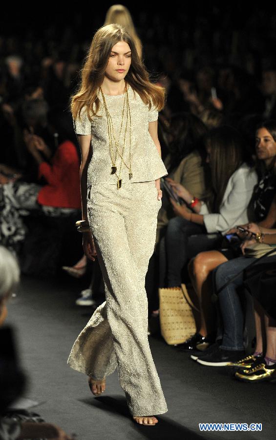 A model displays a creation of Naeem Khan Spring 2015 collection during the New York Fashion Week in New York, the United States, on Sept. 9, 2014. (Xinhua/Wang Lei)