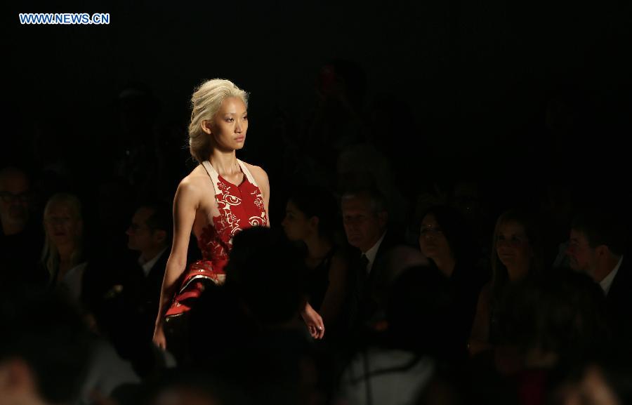 A model presents a creation of the Spring/Summer 2015 SUPIMA collection during the New York Fashion Week in New York, the United States, Sept. 4, 2014. The Mercedes-Benz Fashion Week Spring 2015 opened here on Thursday. (Xinhua/Qin Lang)